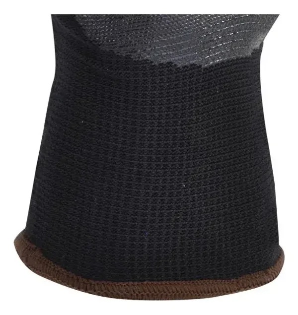 - Guante de nylon y nitrilo sólido negro, sin costuras con puño tejido de puño ribeteado.